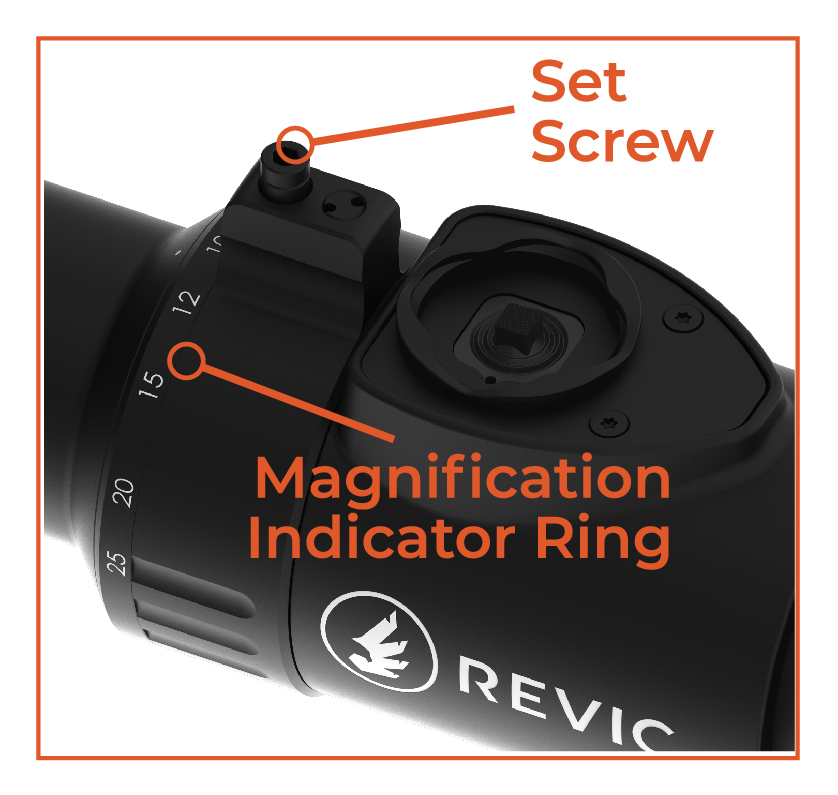 While holding the Magnification Indicator Ring in place, reposition the lever in the desired detent location, and tighten the set screw.  Do Not exceed 2.65 in-lb (0.3Nm).