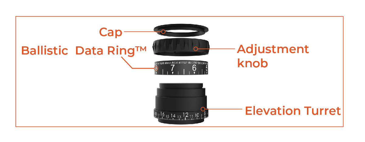 1. Unthread the cap of the elevation turret, and remove the adjustment knob and BDR.