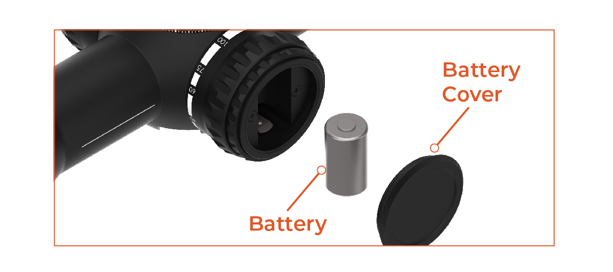 The battery compartment is located in the parallax turret. To install or replace the battery, unscrew the Battery Cover from the Parallax turret. Install a CR2 battery with the positive terminal facing up (matching the pocket shape of the battery compartment). Reinstall the Battery Cover ensuring the cover is secure to provide a watertight seal.