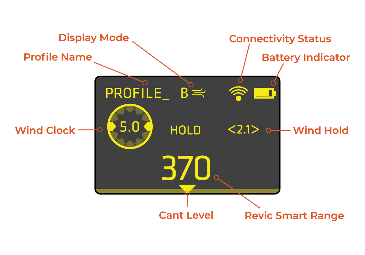 The ballistic elevation adjustment solution is calculated for the selected ballistic profile, shooting and environmental conditions. Simply dial the elevation adjustment to the known target distance and the Revic Digital Werkstream will update the Revic Smart Range in the Center Display Segment as the elevation adjustment is made.